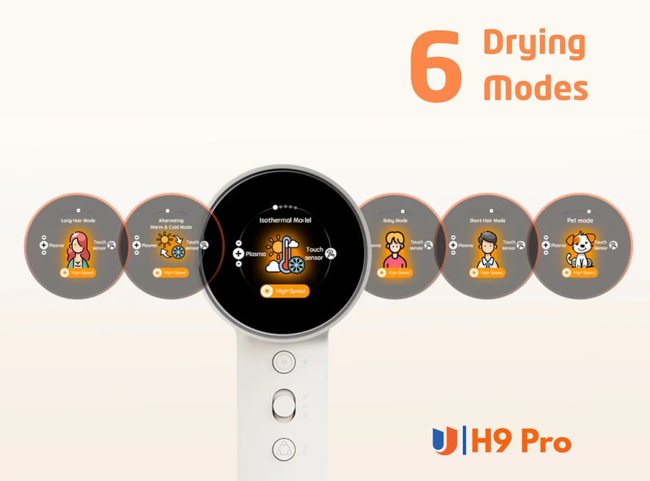 6 Blowing Modes: From Long Hair to Short Hair, Children's Mode for gentle drying, and even a unique Pet Mode for your beloved companions, the H9 Pro offers tailored solutions for every member of your household. The smart display provides intuitive one-touch switching.
